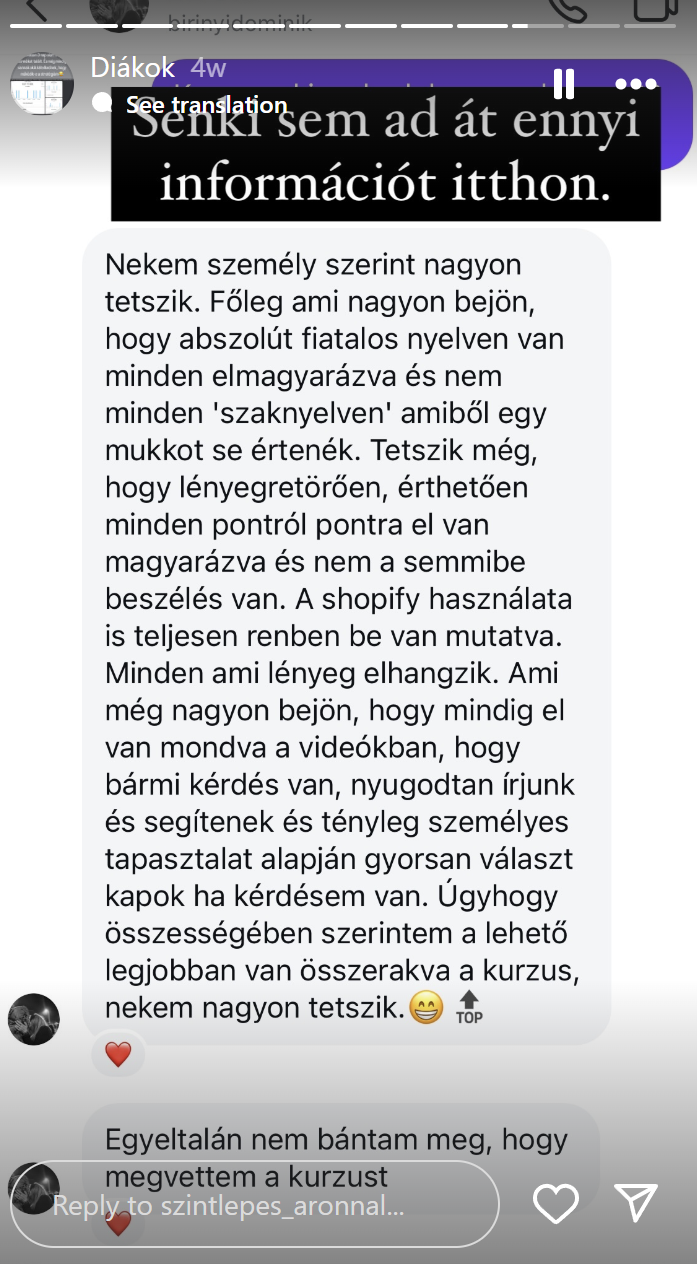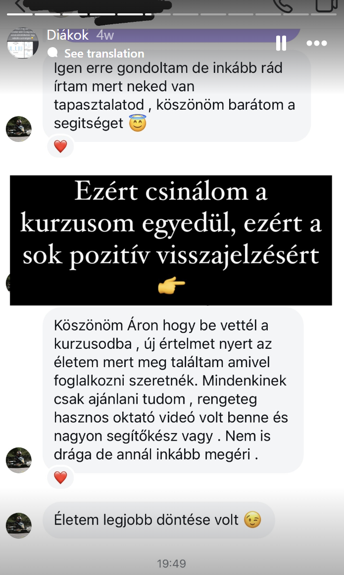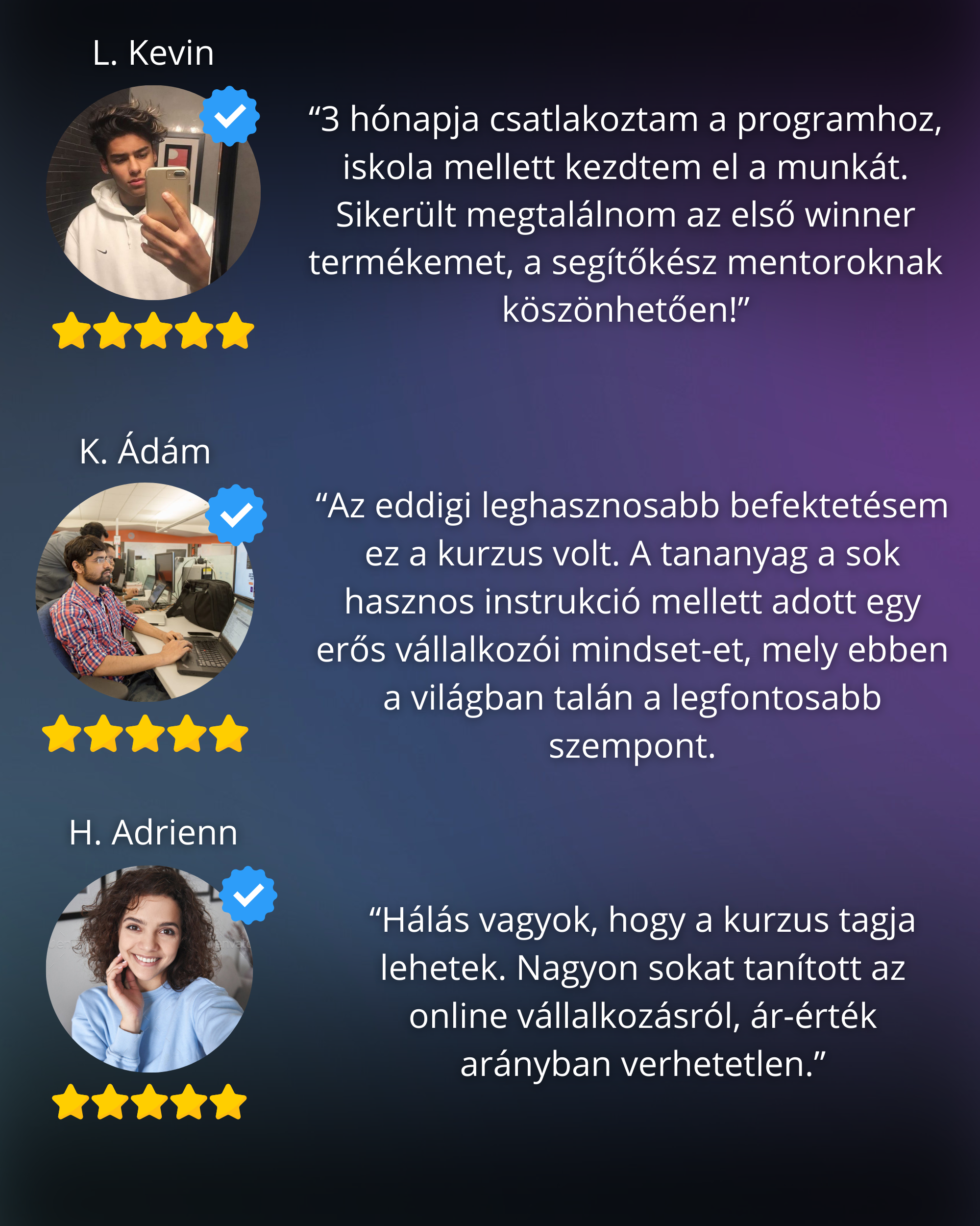“Az eddigi leghasznosabb befektetésem ez a kurzus volt. A tananyag a sok hasznos instrukció mellett adott egy erős vállalkozói mindset-et, mely ebben a világban talán a legfontosabb szempont.”
